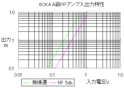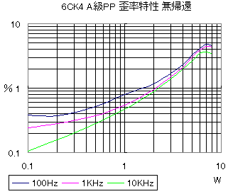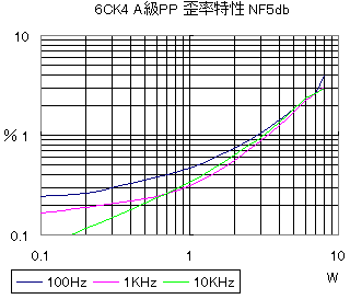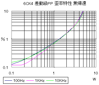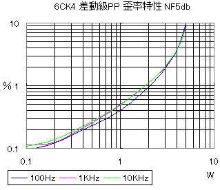 A級PP、差動PPともにプッシュプルアンプの裸特性としては、多少歪みが多目です。これは6CK4自体の直線性があまり良くない事が原因と思われます。又A級PPでは初段と出力段の歪み打ち消しが10KHz当たりが最も巧く働いています、もう少し低い周波数で歪み打ち消しが合うように初段動作点を調整すべきでしょう。