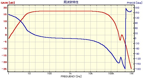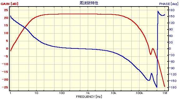 高域280KHzと330KHzに3db程度のディッピとピークが見られます。しかし、この時点ですでにアンプの利得は0db(1倍)を下回っており、このディッピとピークが原因で安定度を損ない事は全くありません。
