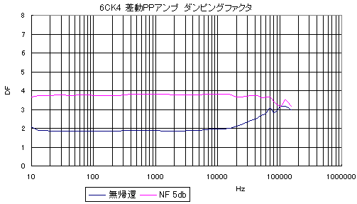 5dbの負帰還を掛けると6.5Hz〜63KHz(+0,-3db)の広帯域となります。可聴帯域内での盛り上がり等も全くありません。低域・高域端は帰還後も素直な減衰特性が保たれています。