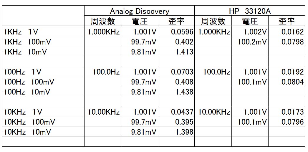 ファンクションジェネレータの定番HP33120Aとも比較しました。