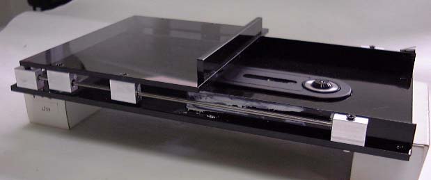 下に写真はCD-ProプレーヤのCD格納部のアクリル製蓋を取り付けるスライド金具です。両脇のアルミブロックが上の写真のプラットホームに固定され中の2つの金具にはスライド機構が組み込まれていてアクリル製蓋を保持して左右に動きます。