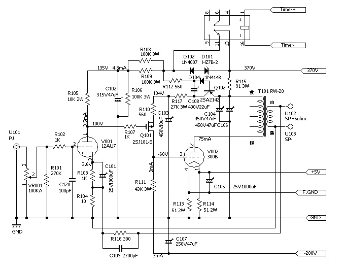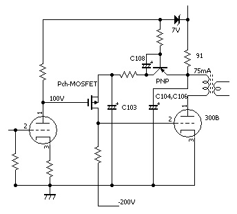 PNPTr Q102 C-B間のC108は300Bの直流電流値にのみ反応し音声信号やその他雑音には反応しない容量が必要です。しかし容量が大き過ぎるとプレート電流自動調整回路の追従性も悪くします。