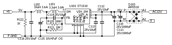 STマイクロ製のDC/DCコンバータ ST1S10を用いた直流安定化電源です。AC12Vを整流した15V0.43Aの電源から5V