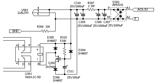 20秒遅延回路は12AU7のヒーター点火用6.3Vから電源をもらい、5Vのリレーを20秒後に動かします。