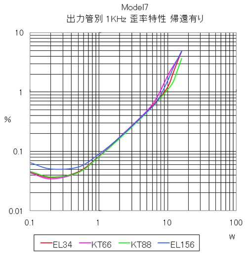 どの管でも約16Wを得ています。アンバランス入力時と同じくKT88の最大出力が良好です。