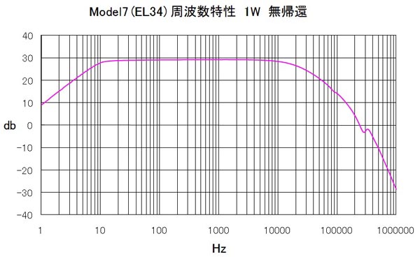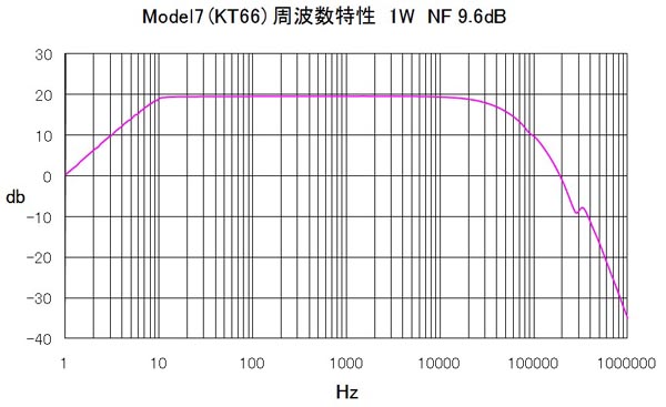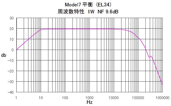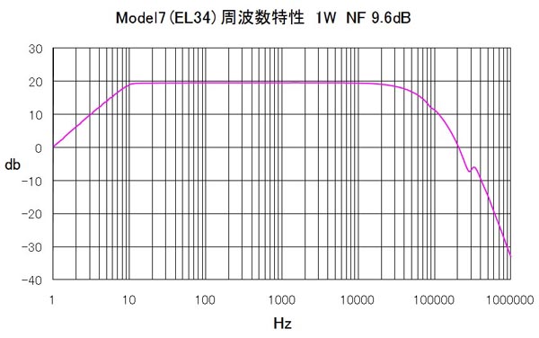 -3dBの帯域は7Hz〜45KHzです。EL34より高域が若干狭くなりましたが、管種による大きな差はありません。