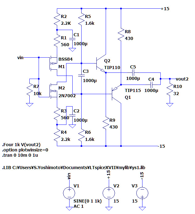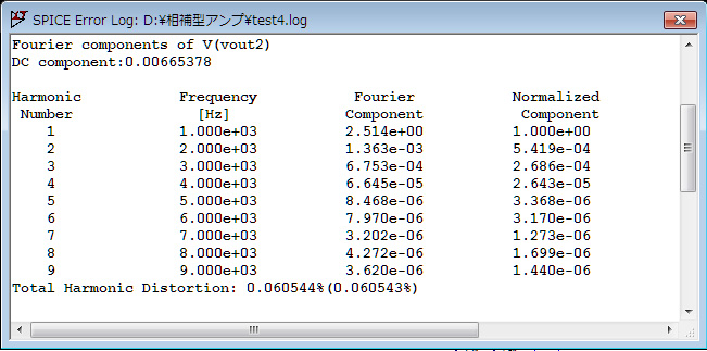 LTspiceにて上図回路の1kHz歪率解析を行いましした。