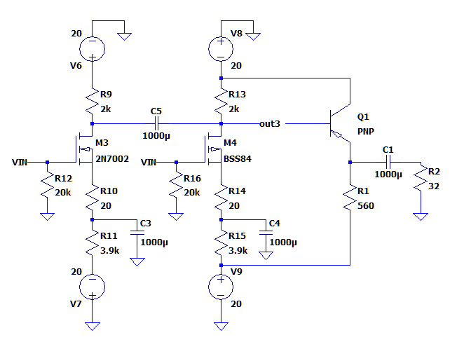 相補式増幅回路解説で説明した回路では低インピーダンス(32Ω)のヘッドホンを駆動できません。
