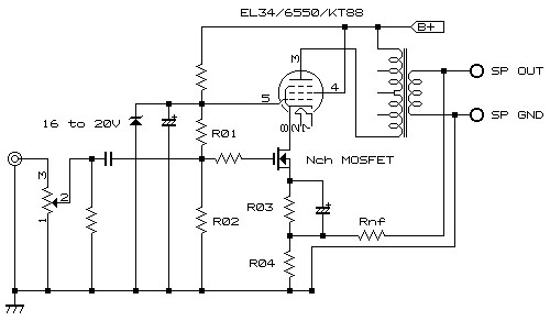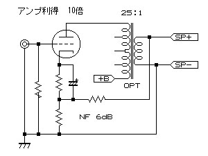下図の5K:6ΩOPTを用い、6dBの負帰還をかけた、増幅度10倍の単段シングルアンプ なら
