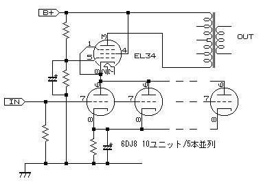 極端な話、下側を1ユニットのgmが0.0125Sの6DJ8を10ユニット/5本並列、上側はEL34 1本で構成すれば 増幅度500倍の出力段ができそうです。