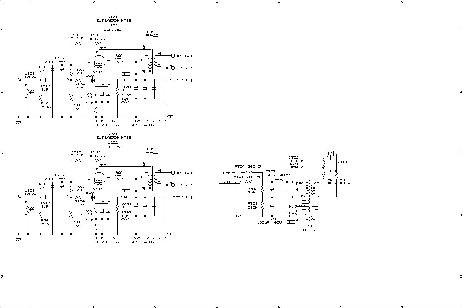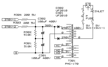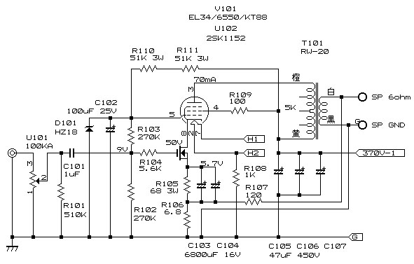 ここでR106の抵抗値が大きいと自己帰還が掛かってしまい出力段の増幅度が下がってしまいます。R106は出力トランスの負荷抵抗 5KΩの1/1000から1/500としなくてはなりません。