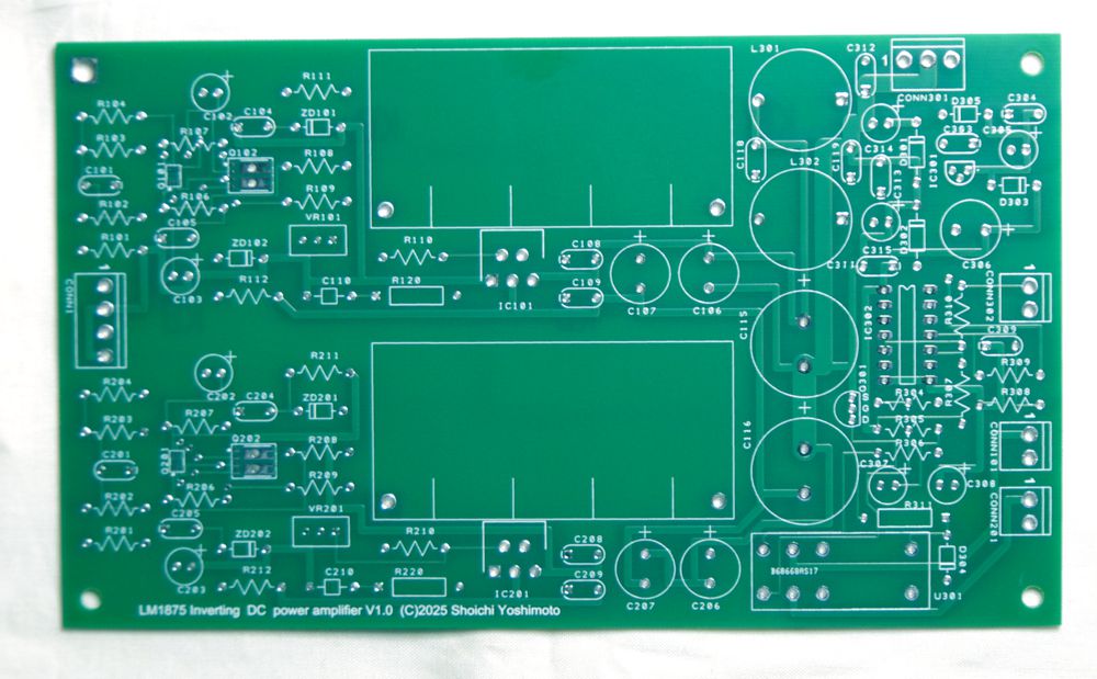 出力オフセット調整用可変抵抗器 V101、V201にて出力端子のDC電圧を±10mV以内に調整します。